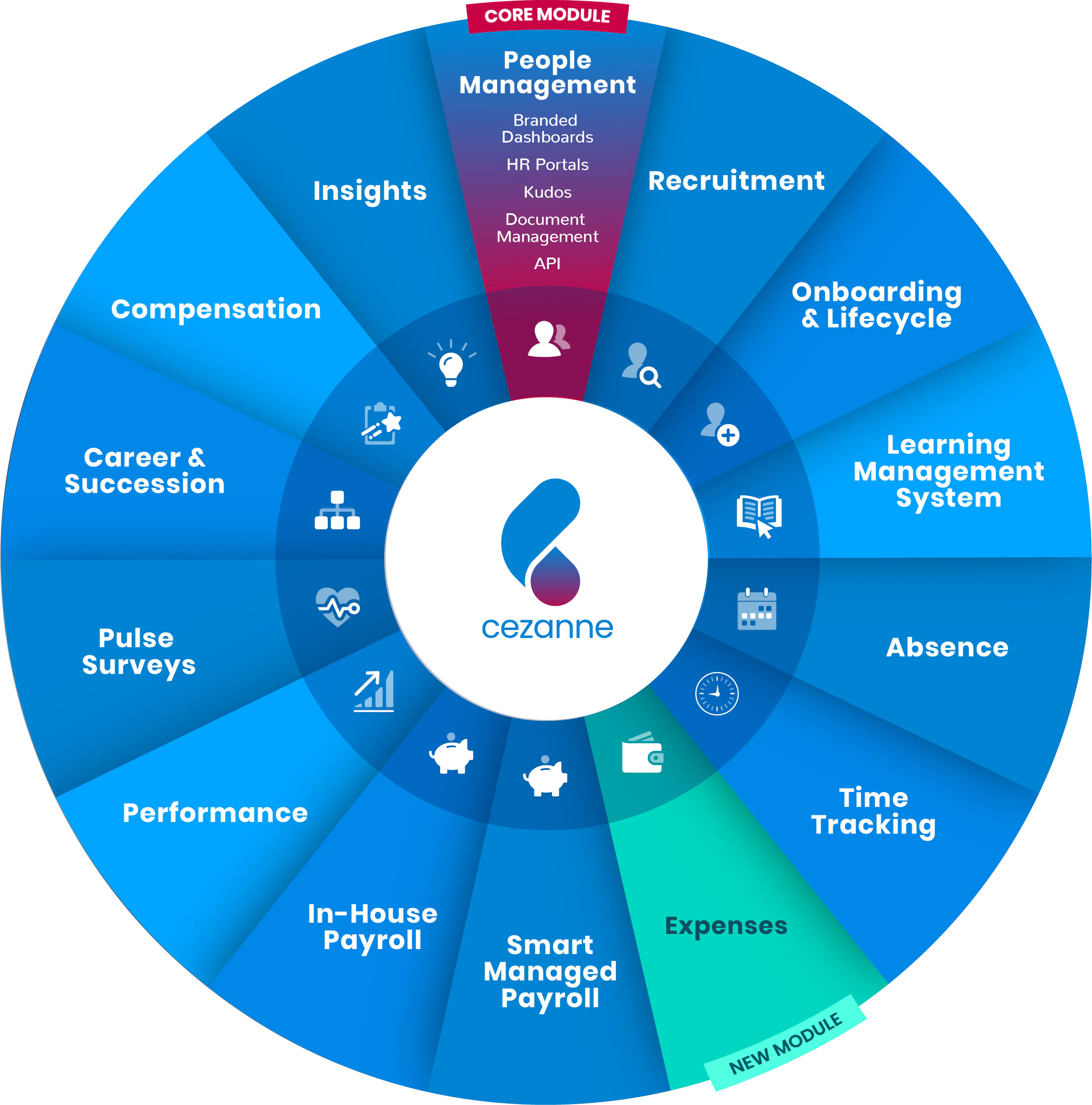 Covering the full employee lifecycle, Cezanne software includes integrated modules for core HR, recruitment, onboarding, absence and performance management, pulse surveys, time tracking, career and succession planning, workforce analytics, compensation planning and both in-house and managed payroll – together with an integration platform service and open APIs to leading third-party solutions.